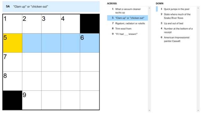 “‘Clam up’ or ‘chicken out'” NYT Mini Crossword puzzle clue hints and answers