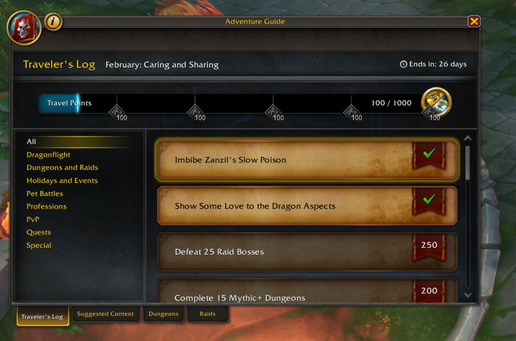 Many of the tougher tasks in the Traveler’s Log, like completing 15 Mythic+ dungeons or killing 10 Dragonflight raid bosses, award you with 200 Travel Points, while some tasks that require you to complete world content will grant 100 to 150 points. If you’re in need of a quick 50 Travel Points, though, there are easier tasks that are completable in a few seconds.